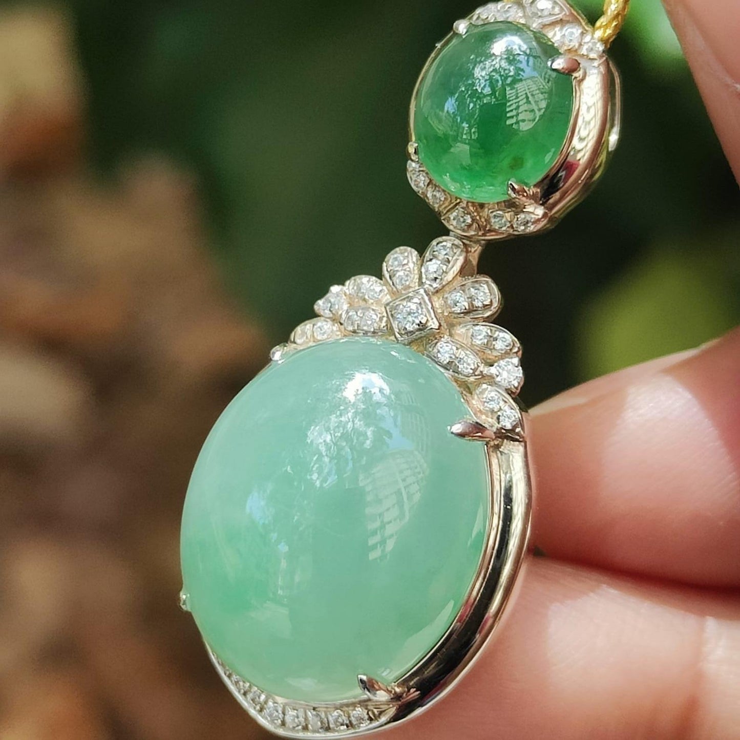 Temukan harmoni alam dan seni yang sempurna dalam liontin giok Burma ini. Menampilkan dua cabochon yang menawan—zamrud es yang semarak (8,5 * 7,2 * 3,9 mm) dan cabochon hijau muda yang lebih besar (17,2 * 14,6 * 6,5 mm)—karya ini merupakan perayaan kontras. Dilapisi perak S925 berkualitas tinggi, liontin ini berukuran 37,2 * 17 * 11,7 mm dan berat 7,48 gram, menawarkan keseimbangan antara keberanian dan kehalusan.