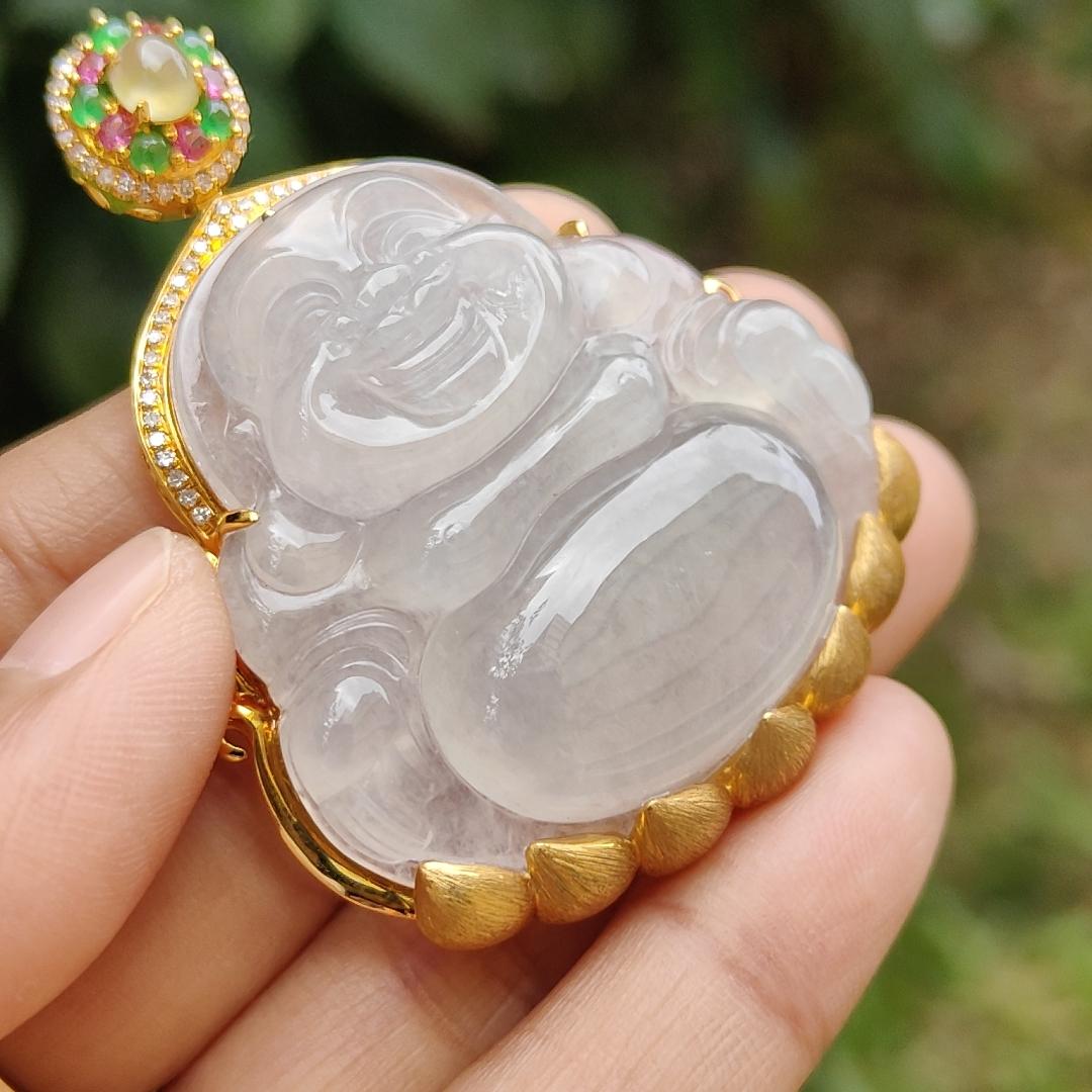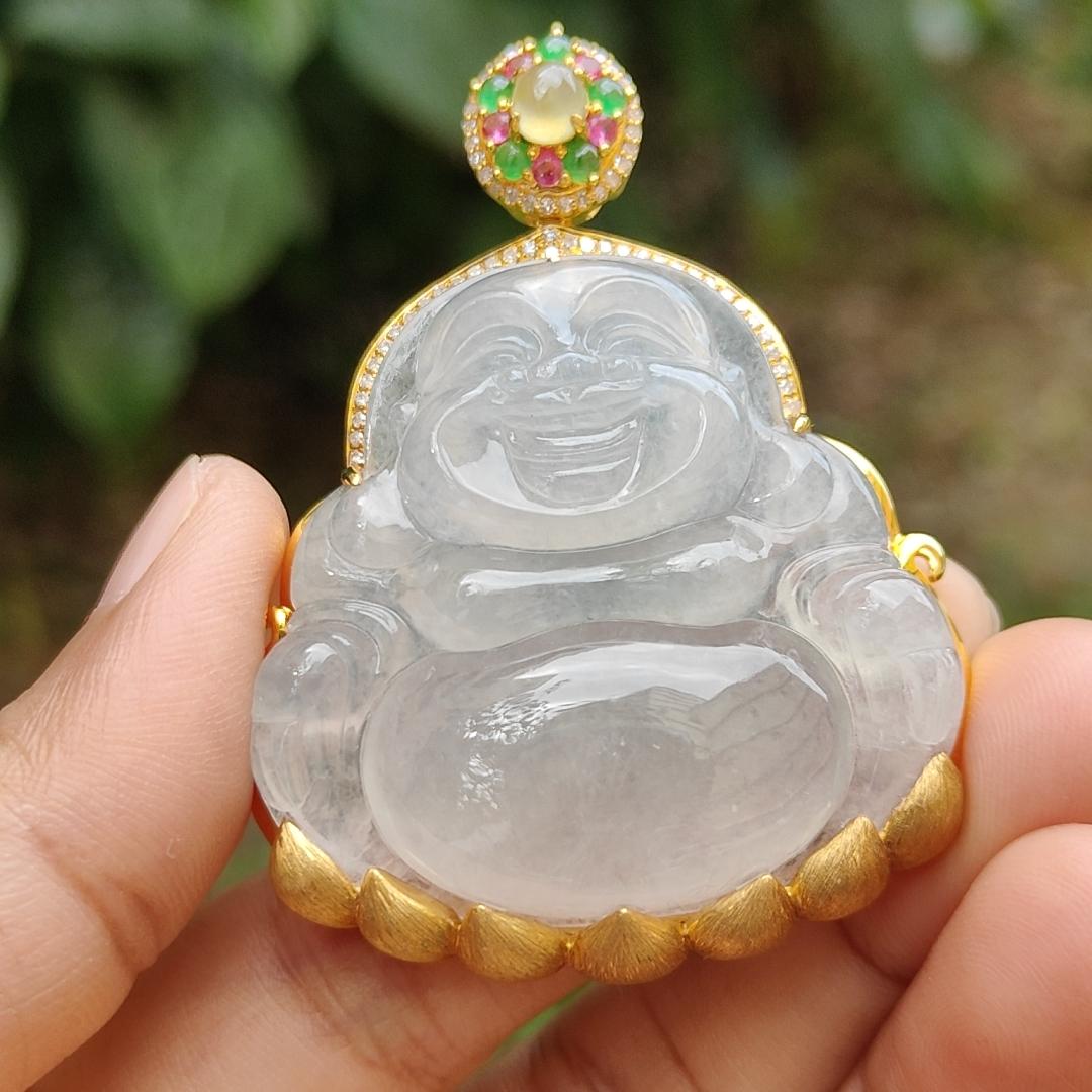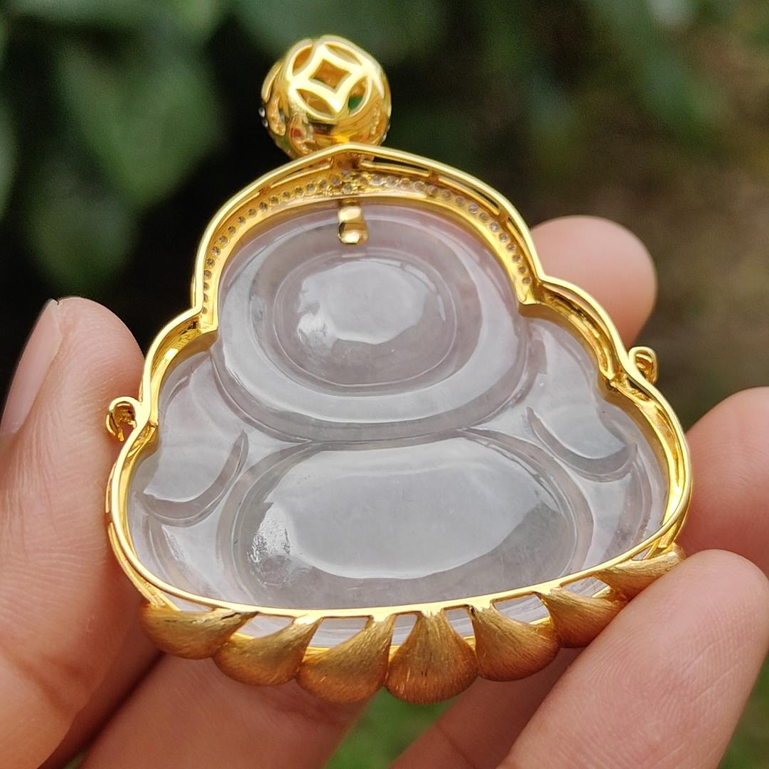 Batu Giok Jadeite Alami Jenis A Transparan Es Premium dibuat sebagai Buddha Milo yang dipasang pada emas 18 karat dengan berlian sebagai Liontin, sertifikat berat 26,07 gram, ukuran 38,8 * 40 * 7,2 mm, (18kp41)
