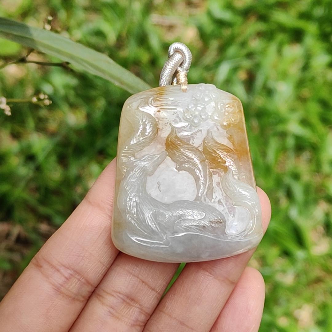 Kalung Liontin Jadeite Tipe A Alami Semi Es Kuning dan Putih dibuat dengan sembilan ekor rubah simbol Cinta, Karisma, dan Keberuntungan, sertifikat yang disetujui QIC Labs disertakan berat 32,9 gram, 44 * 36 * 9 mm, cocok untuk dipakai sehari-hari