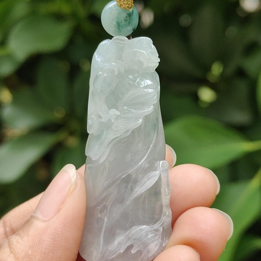 A Bamboo with Pixiu Crafted on Light Green Hue with Light Lavender Natural Type A Burmese Jadeite Jewellery certificate weighs 23.91 grams, measurement 50.3 * 20.6 * 12.8 mm (pendant 318)
