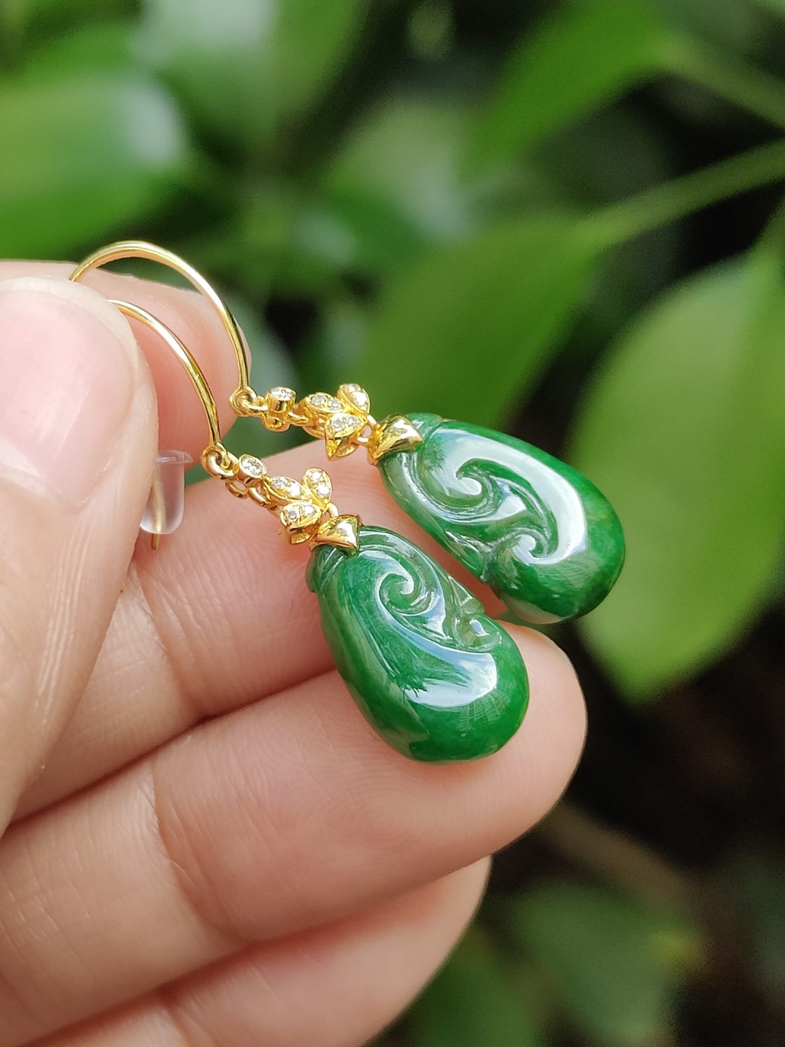 "Each earring is a miniature masterpiece: 35mm of meticulously carved jadeite, its verdant hues echoing the lush valleys of Myanmar. The 1.13 grams of 18k gold, set with 14 glittering diamonds, are not mere accents but celestial guideposts—tiny stars to illuminate your path. Weighing just 3.26 grams, they grace your ears with the weight of intention, not burden."