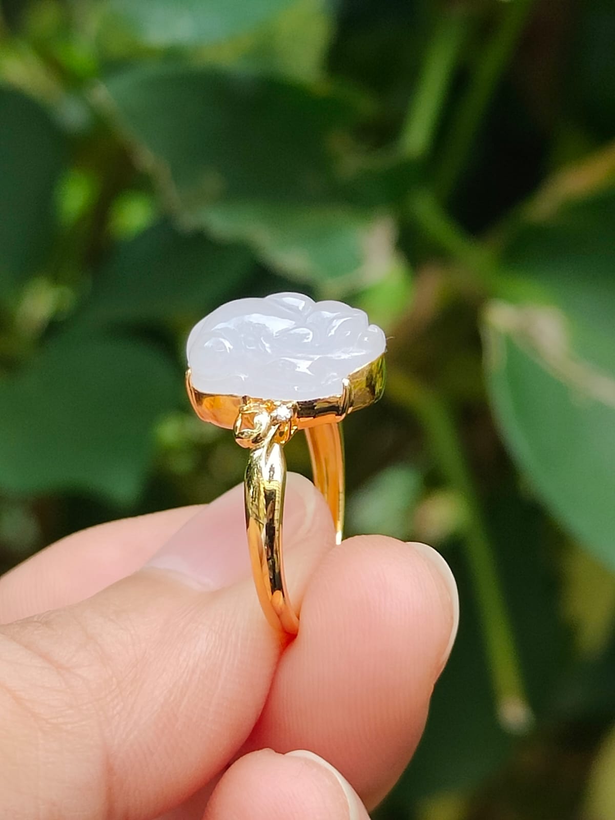 This exquisite ring features a Pixiu design crafted on natural Type A Jadeite Jade, set on 18k gold for a luxurious touch.