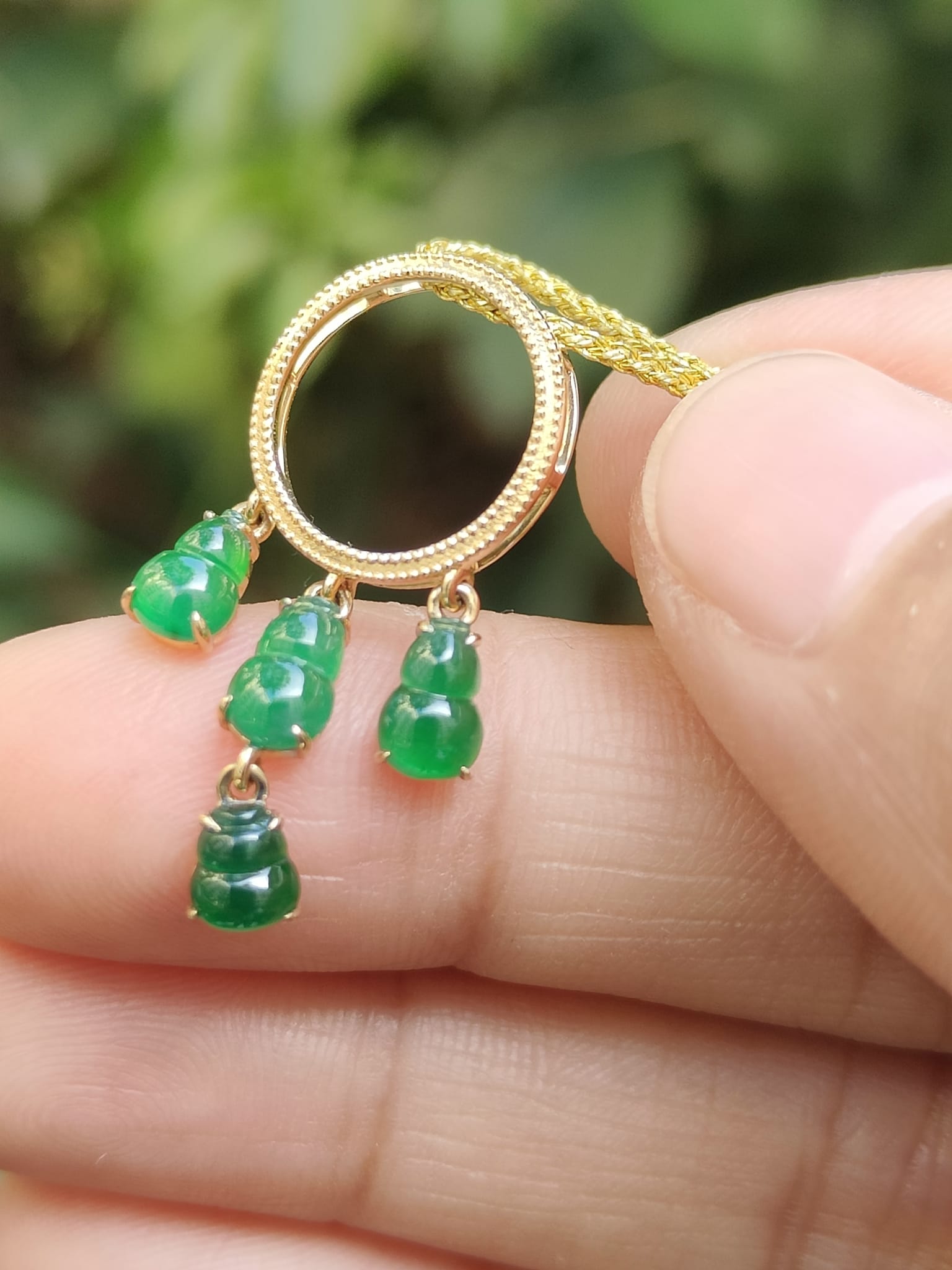 Discover the elegance of the Four Green Gourd Shape Natural Type A Jadeite Jade Pendant, beautifully set with 18k gold. This exquisite piece weighs 1.66 grams and comes with a certificate of authenticity.