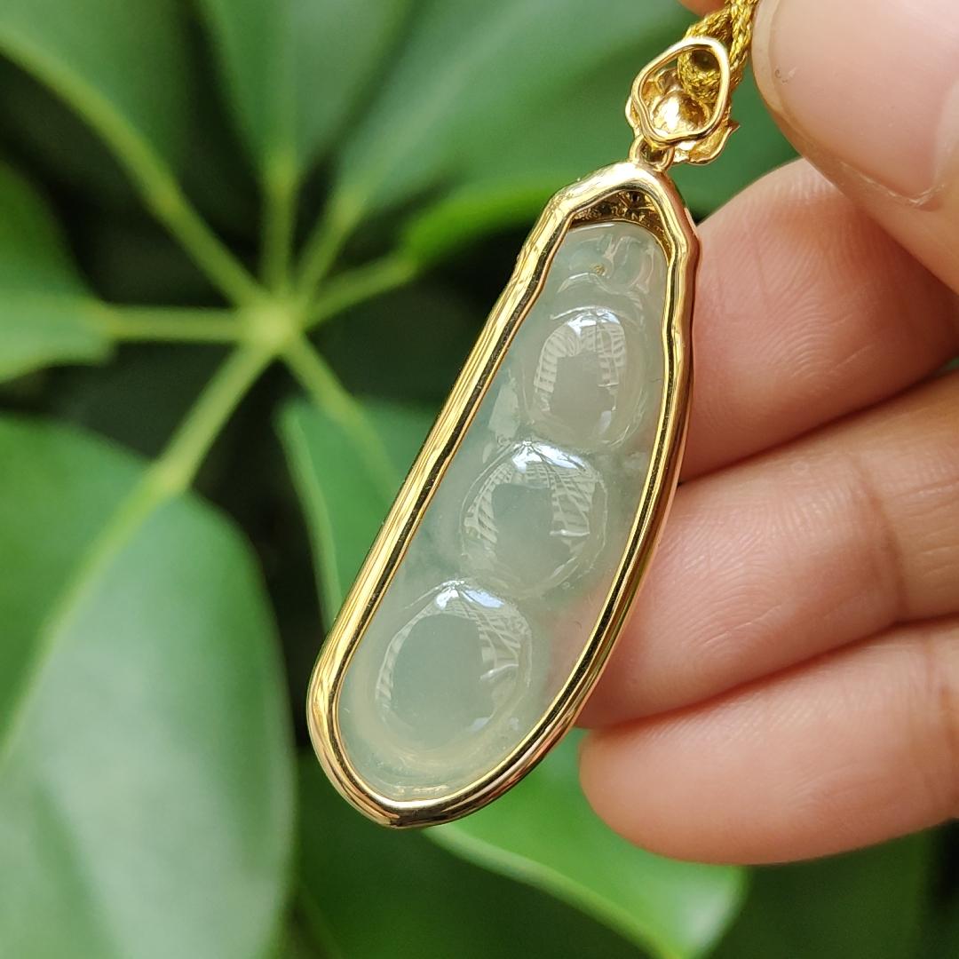 This High-Quality Natural Type A Jadeite Jade Pendant Necklace features a Good Translucent Light Green Hue, crafted in the shape of a Bean and set on 18k gold.