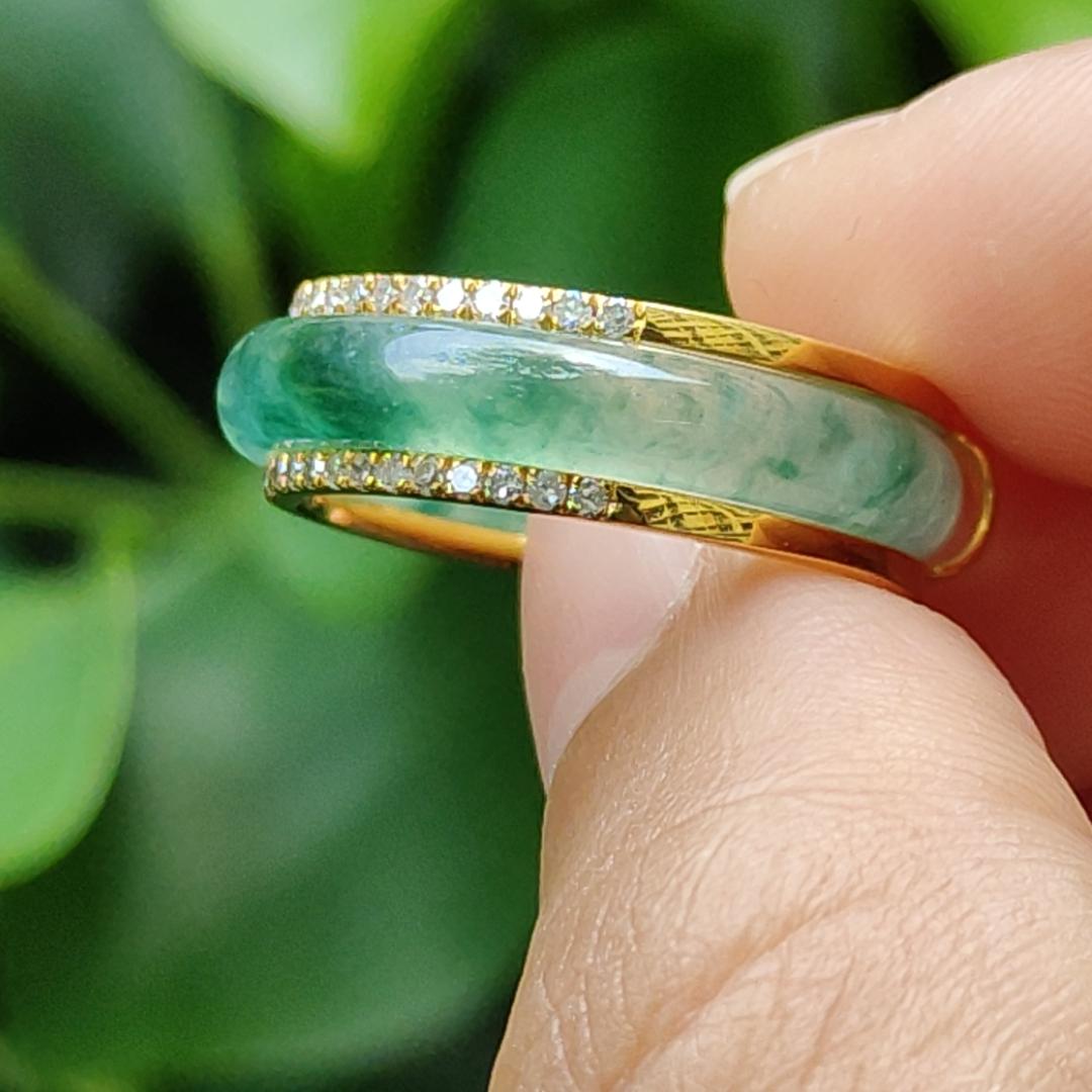 Icy Translucent Green Floating Patches Natural Type A Jadeite Jade crafted as Ring designed with removable 18k Gold, certificate weighs 4.65 grams, measurement 6.3 * 2.9 mm, finger size 17.1 mm (18kring29)
