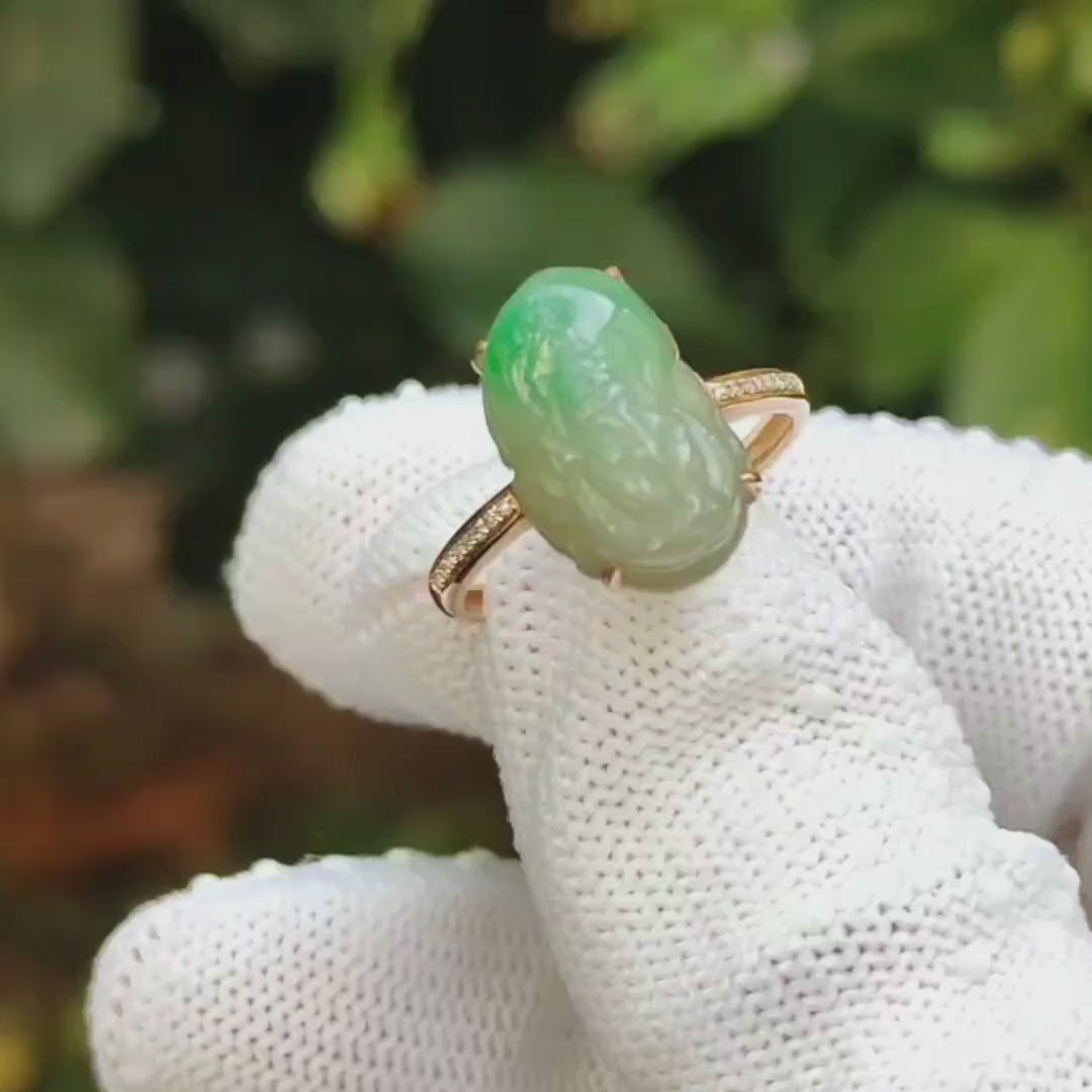 Local SG Seller - Very Beautiful 18k Gold Ring set with High Quality Natural Jadeite Jade crafted as Pixiu certificate weighs 2.82 grams, measurement 14.6 * 9.3 * 6.1 mm (18kring33)