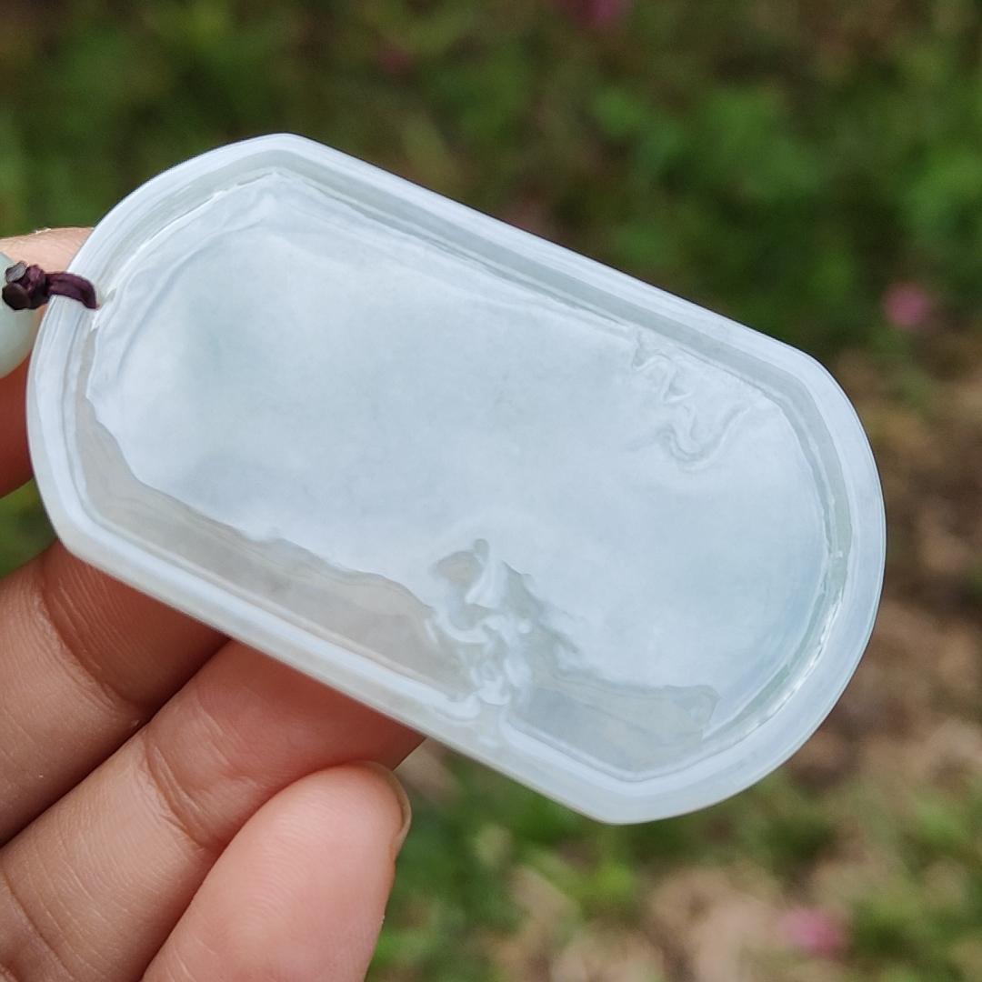 Quality Semi Icy White and Light Green Patches Natural Type A Jadeite Jade crafted with sceneries as pendant with QIC labs approved certificate weigh 24.89 grams, measurement 54 * 32 * 4.5 mm (pendant227)