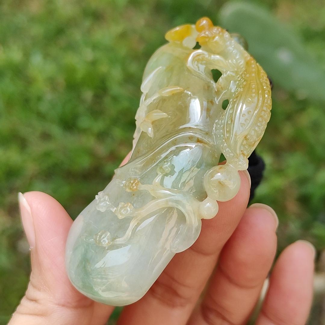 Very Rare Green and Yellow with Red patches Praying Mantis Pendant Necklace Natural Type A Jadeite with certificate included weigh 53.96 grams, 72.5 * 35.5 * 12.8 mm, collectible item