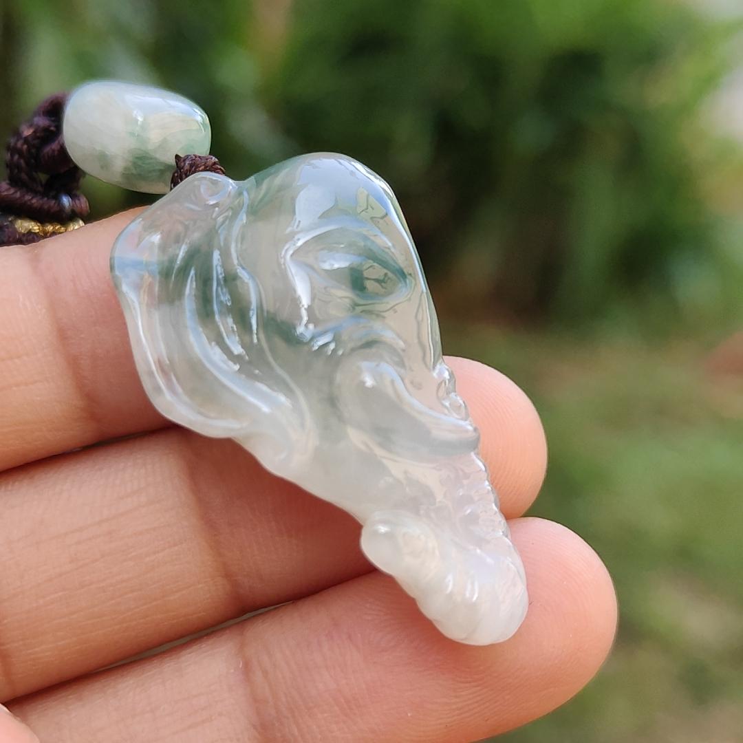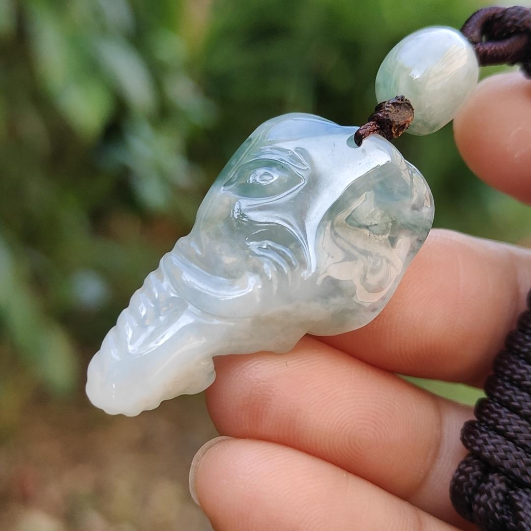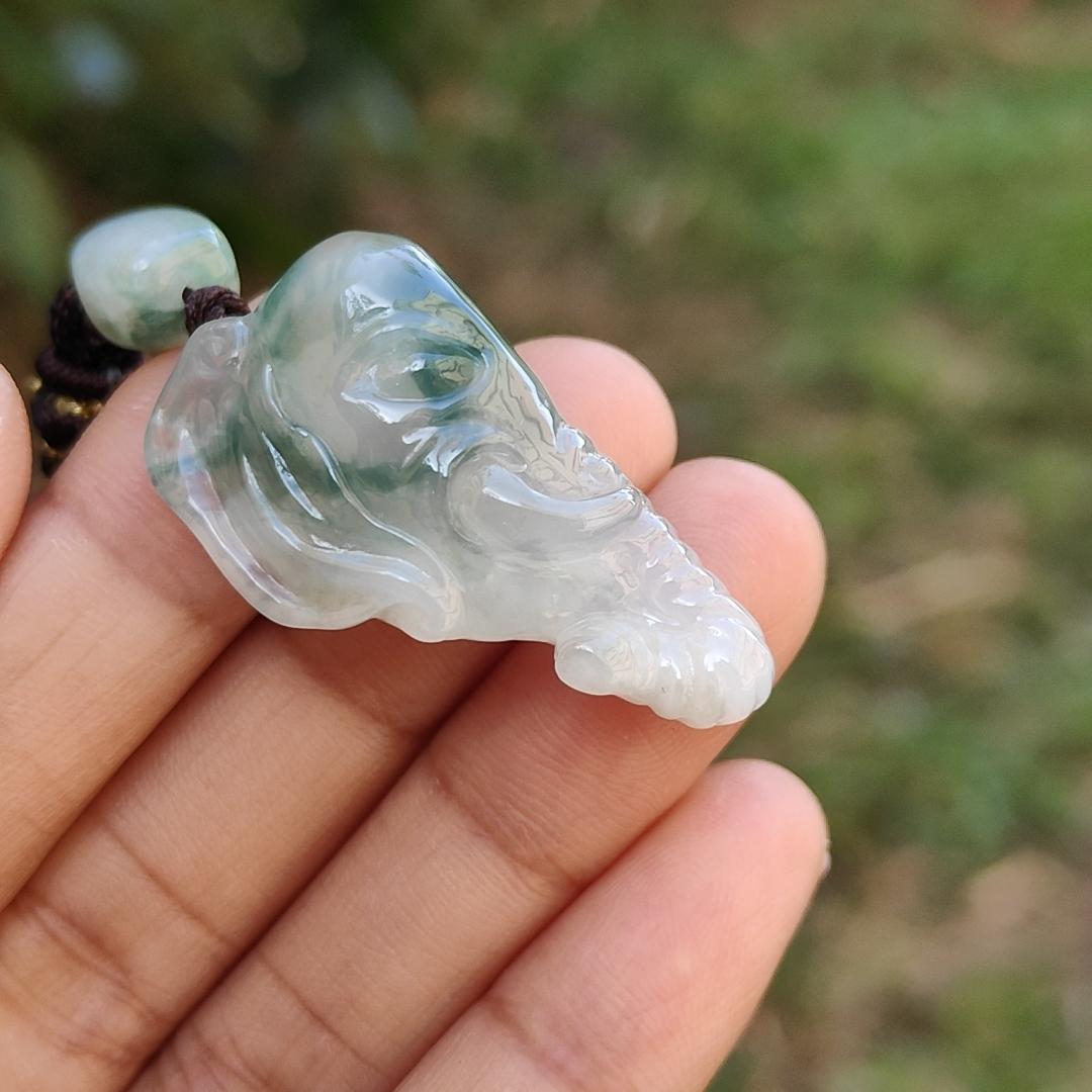 This Very Rare Semi Icy Light Green Patches Natural Type A Jadeite Jade necklace features an exquisite Elephant pendant, making it a unique and eye-catching accessory.