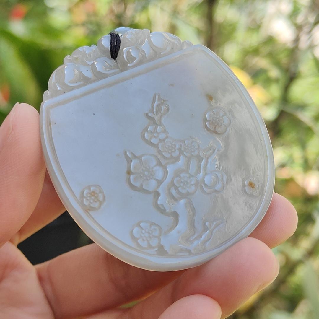 这条精美的项链配有天然 A 级翡翠吊坠,重 34.14 克,尺寸为 54.3 * 47.5 * 5.6 毫米(吊坠 105),装饰有精心制作的梅花和鹿。