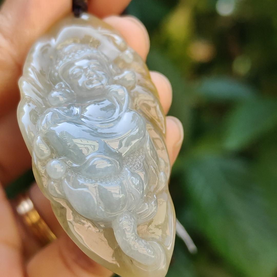 今天就为您的衣柜增添一些色彩,添加这款罕见的淡紫色、柠檬黄加棕色、A 类天然翡翠吊坠,雕刻成小佛形状!